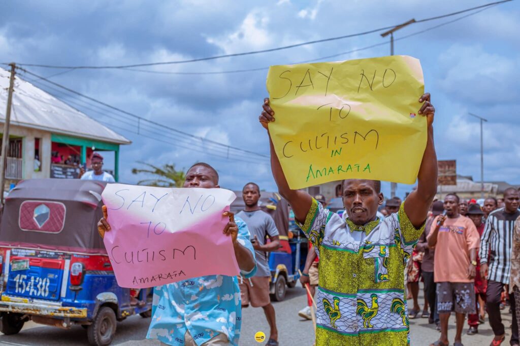 Participants carried placards with inscriptions such as “Say No to Cultism” and “Amarata Must Be Free,” while community stakeholders called on security agencies and civil society to support their campaign for lasting peace.