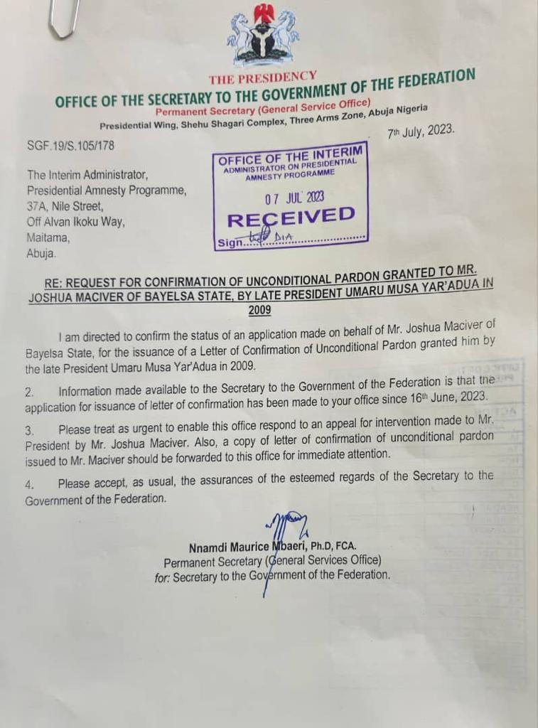 It was gathered that the office of the Secretary to the Government of the Federation (SGF) had through a letter signed by the Permanent Secretary, (General Services), Nnamdi Maurice Mbaeri PhD on the 7th of July, 2023 and with reference number SGF 19/S.105/178, requested for confirmation of Joshua Maciver as one of the beneficiaries of the Presidential pardon offered by late President Musa Yar’Adua.