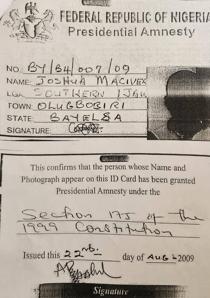 It would be recalled that nvestigations had revealed that the Presidential Amnesty office under Maj Gen Barry Tariye Ndiomu (rtd.) have disowned Joshua Maciver as not being a “beneficiary of the late President Umaru Musa Yar’Adua pardon in 2009.”
