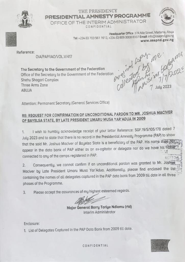 According to the letter, “Joshua Maciver’s name does not appear in the data bank either as ex-agitator or delegate registered in the PAP. Consequently, we cannot confirm if an unconditional pardon was granted to Joshua Maciver by Late President Yar’Adua in 2009.”