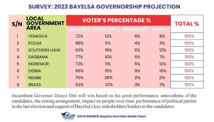 The survey report indicated that Diri is expected to win massively even in LGAs believed to have opposed him in the 2019 guber election. The survey clearly puts the incumbent Governor Diri ahead in Nembe LGA with 70 per cent, Brass (62 per cent), Ogbia (66 per cent), Southern Ijaw (63 per cent) and the State capital, Yenagoa Local Government Area (70 per cent).