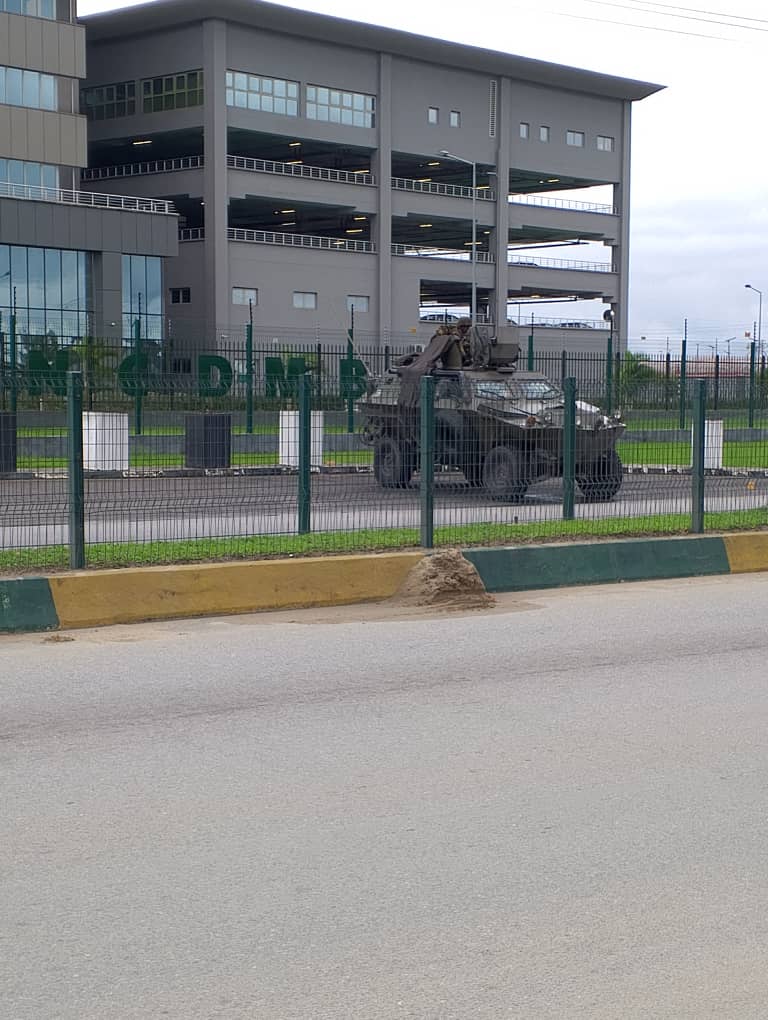 Also at the Nigeria Content Development and Monitoring Board, am armoured vehicle was stationed in front of the building with security personnel guiding the premises.