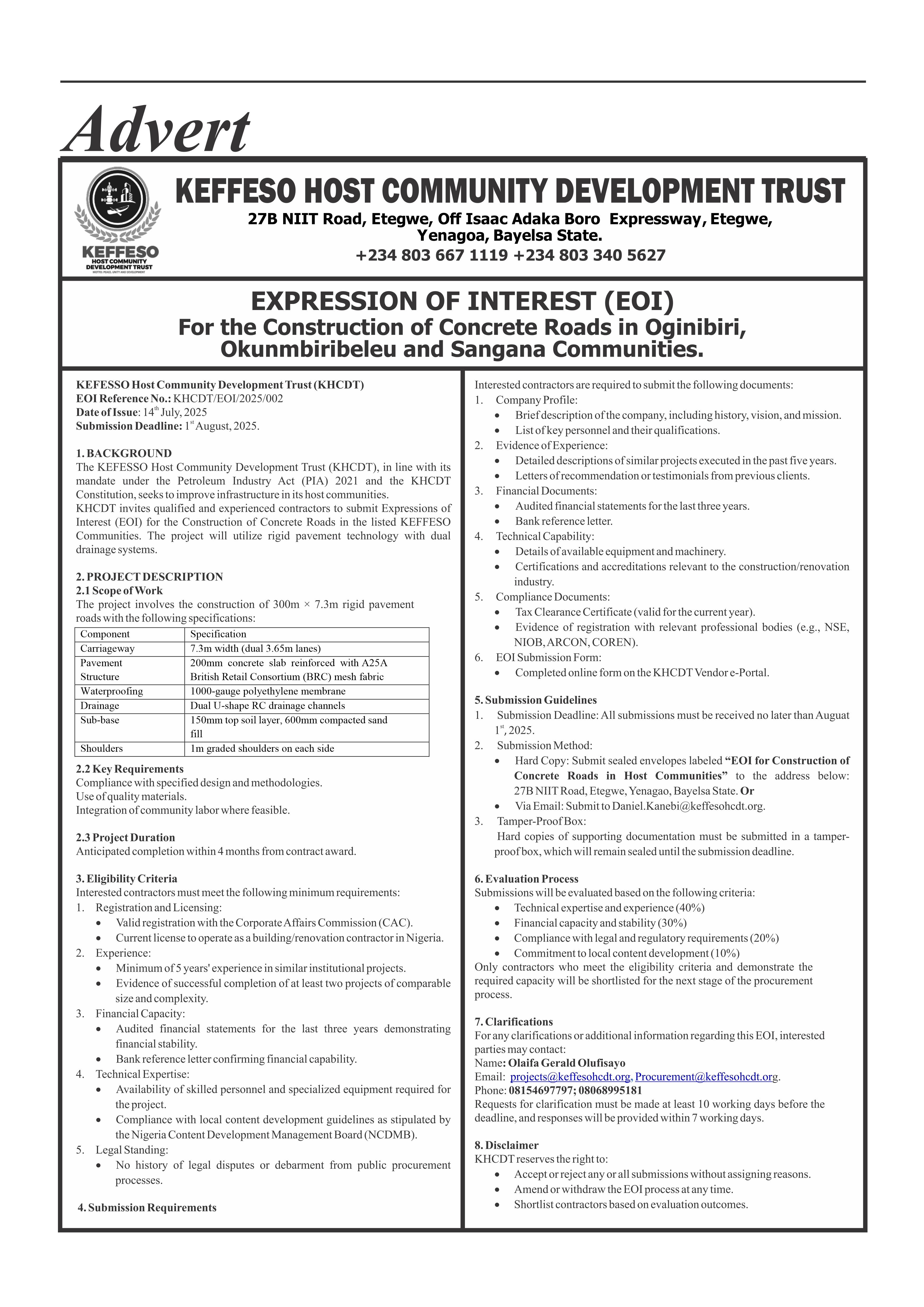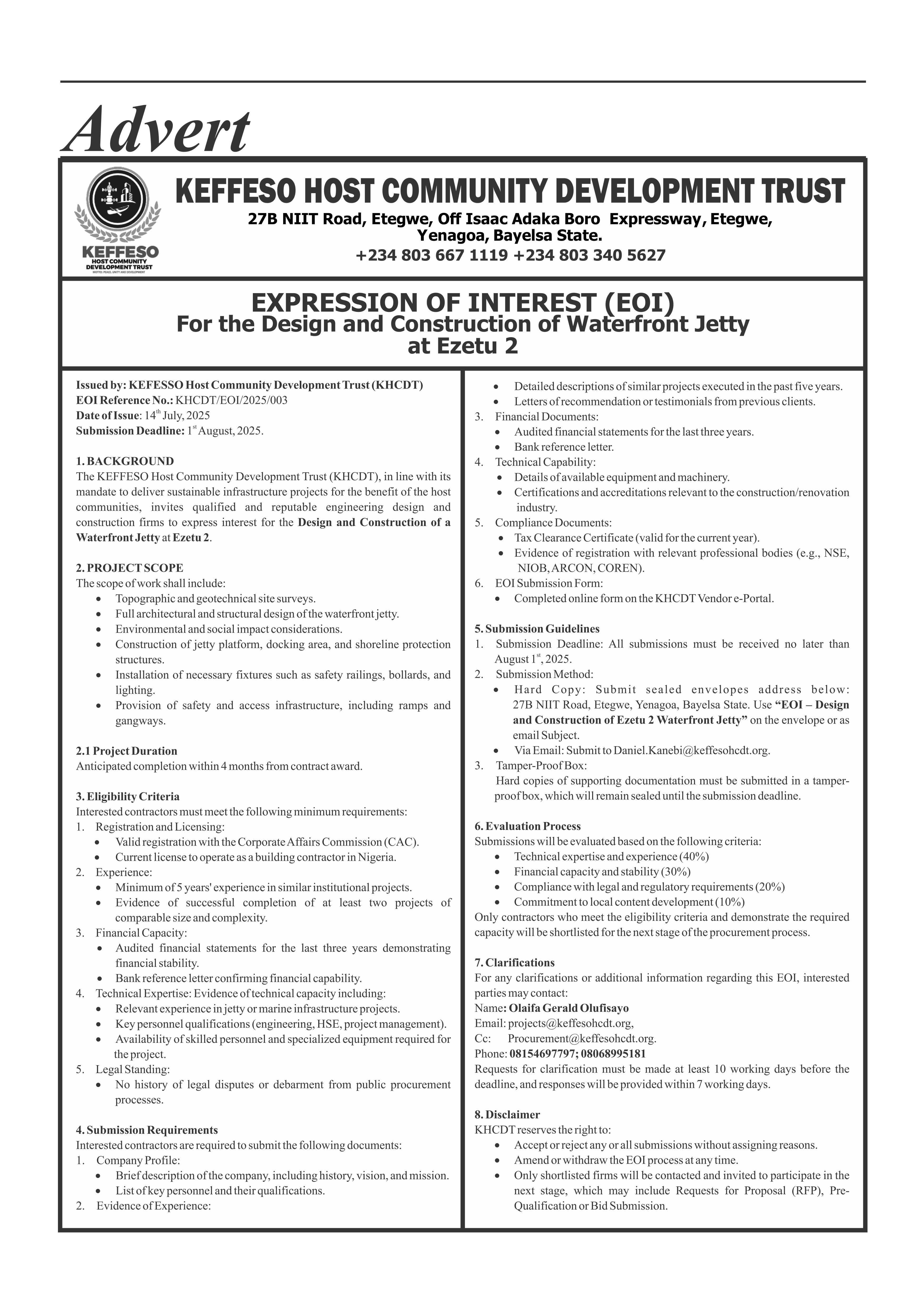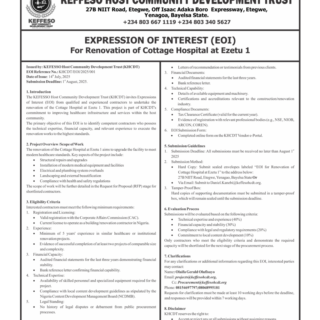 The full details of the Expression of Interest publication can be found in the Niger Delta Herald edition dated Wednesday, July 16th – Tuesday, July 22nd, 2025.