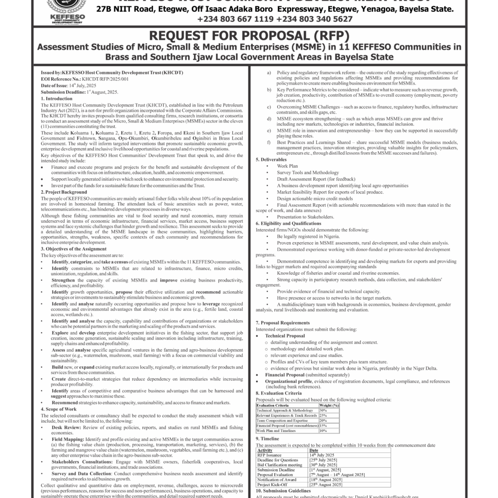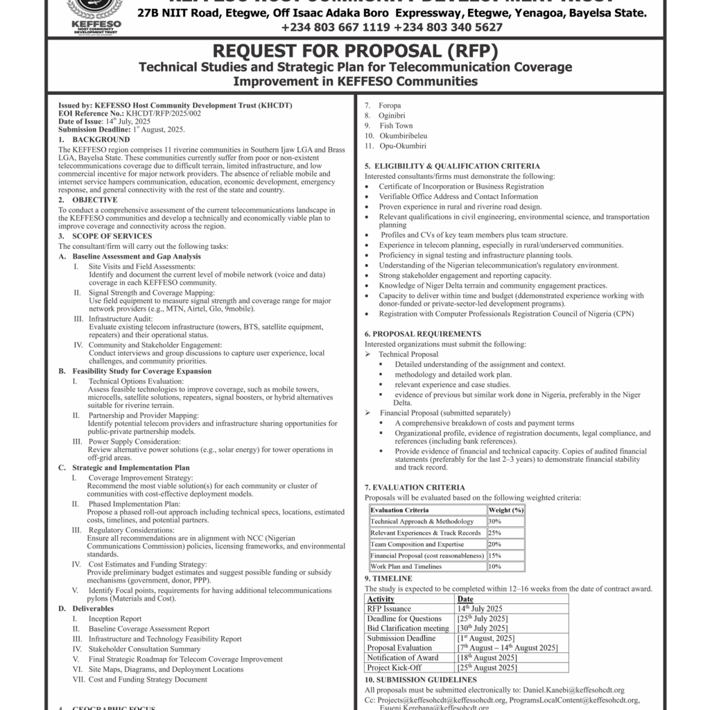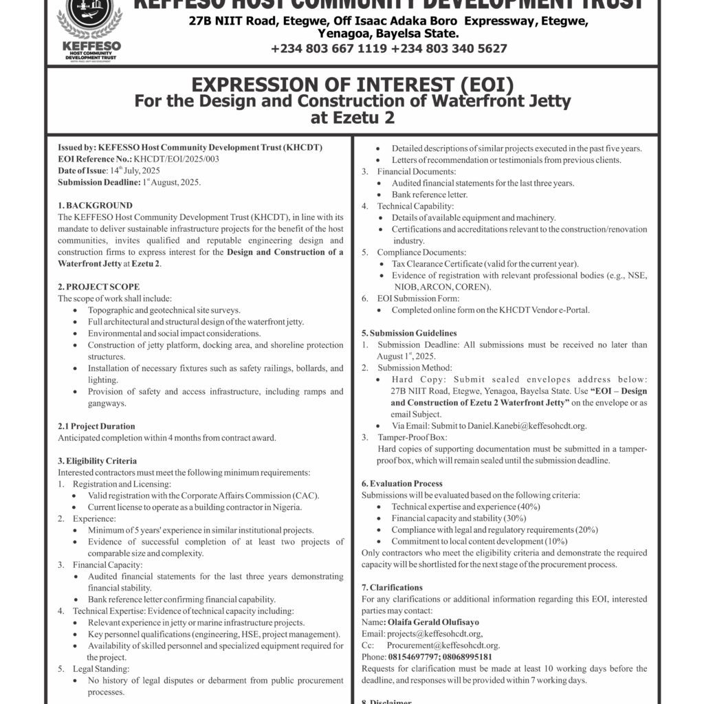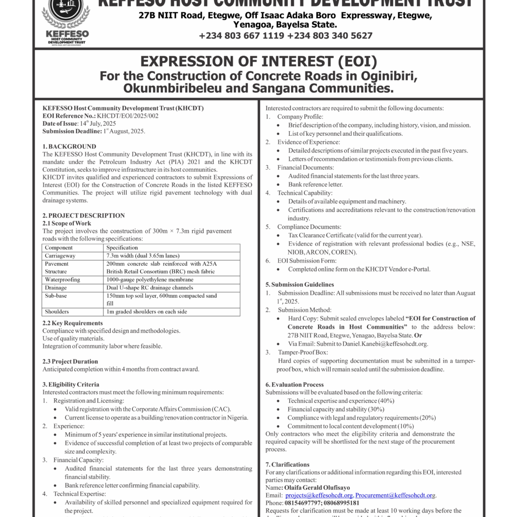 The KEFFESO Host Community Development Trust invites reputable contractors to submit bids for various projects planned for execution within the trust’s communities.