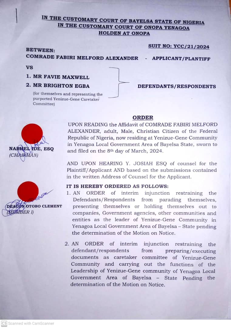 The accusation was contained in a letter addressed to the President of the Customary Court of Appeal, through the Chief Registrar of the Court dated 11th day of July, 2024 and signed by the Community Development Committee (CDC) Chairman of Yenizue-gene Community, Yenagoa, Comrade Fabiri Melford Alexander.