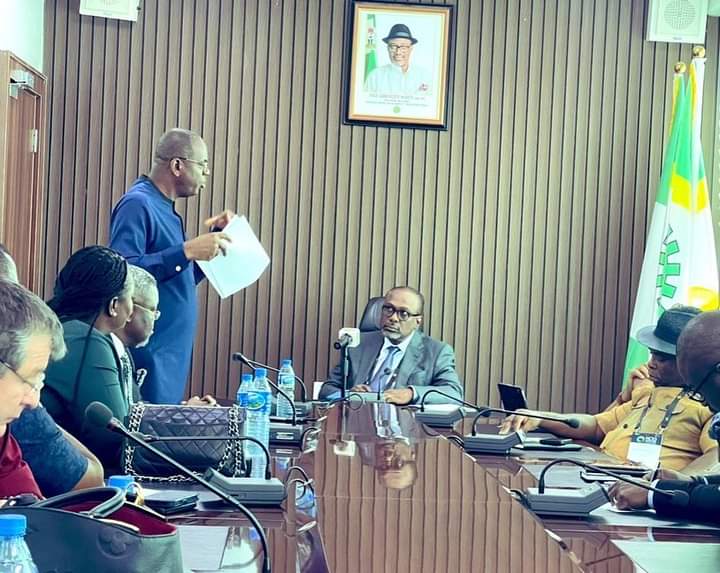 Engr. Simbi Kesiye Wabote FNSE, Executive Secretary NCDMB, received the Industry-Wide Implementation Committee Report for In-Country Manufacturing of Pumps, Valves, Flanges, Gaskets, Bolts and Nuts led by the Chairman of the committee, Cyprian Ojum, at the Board’s liaison office, Abuja.