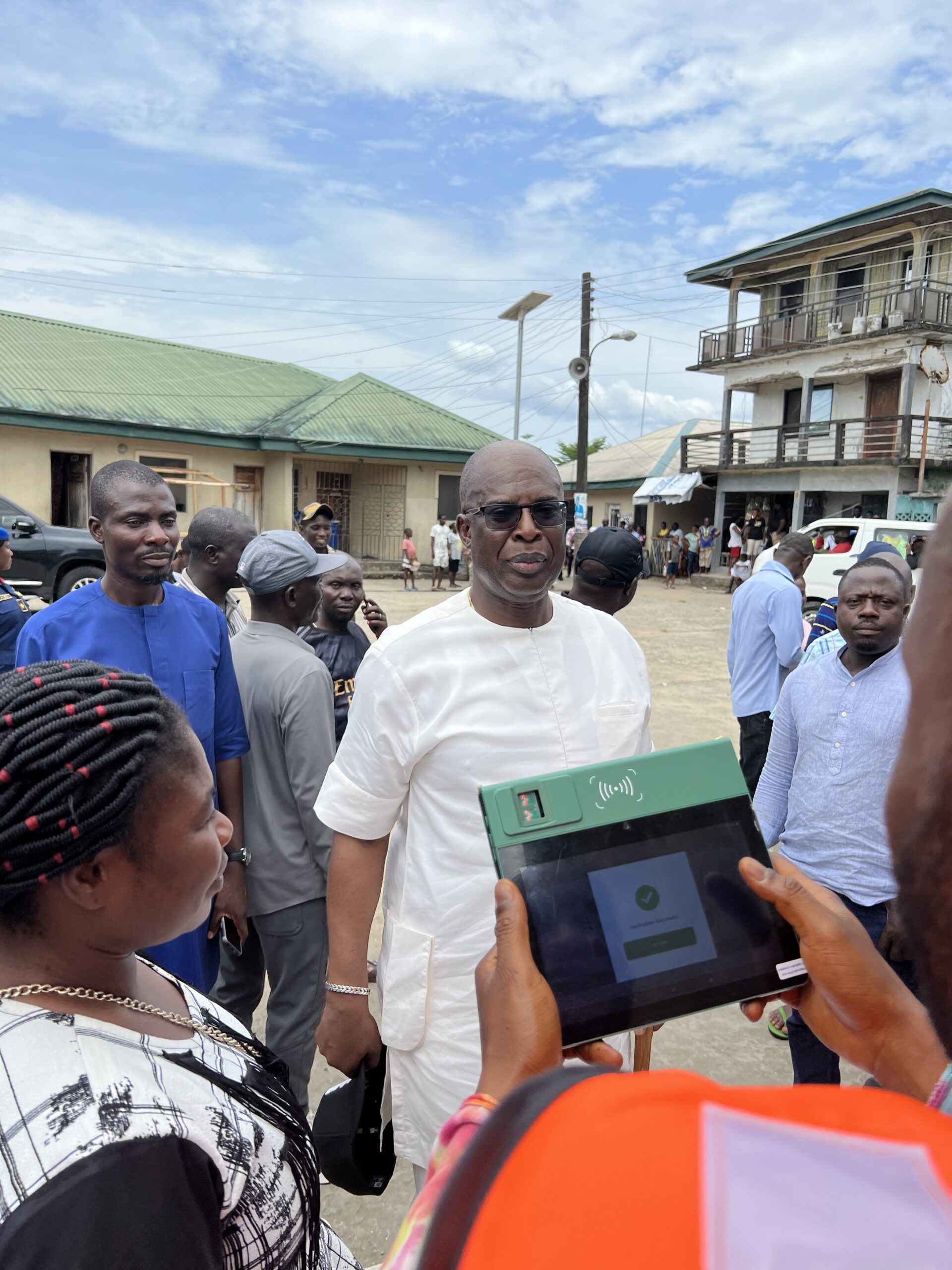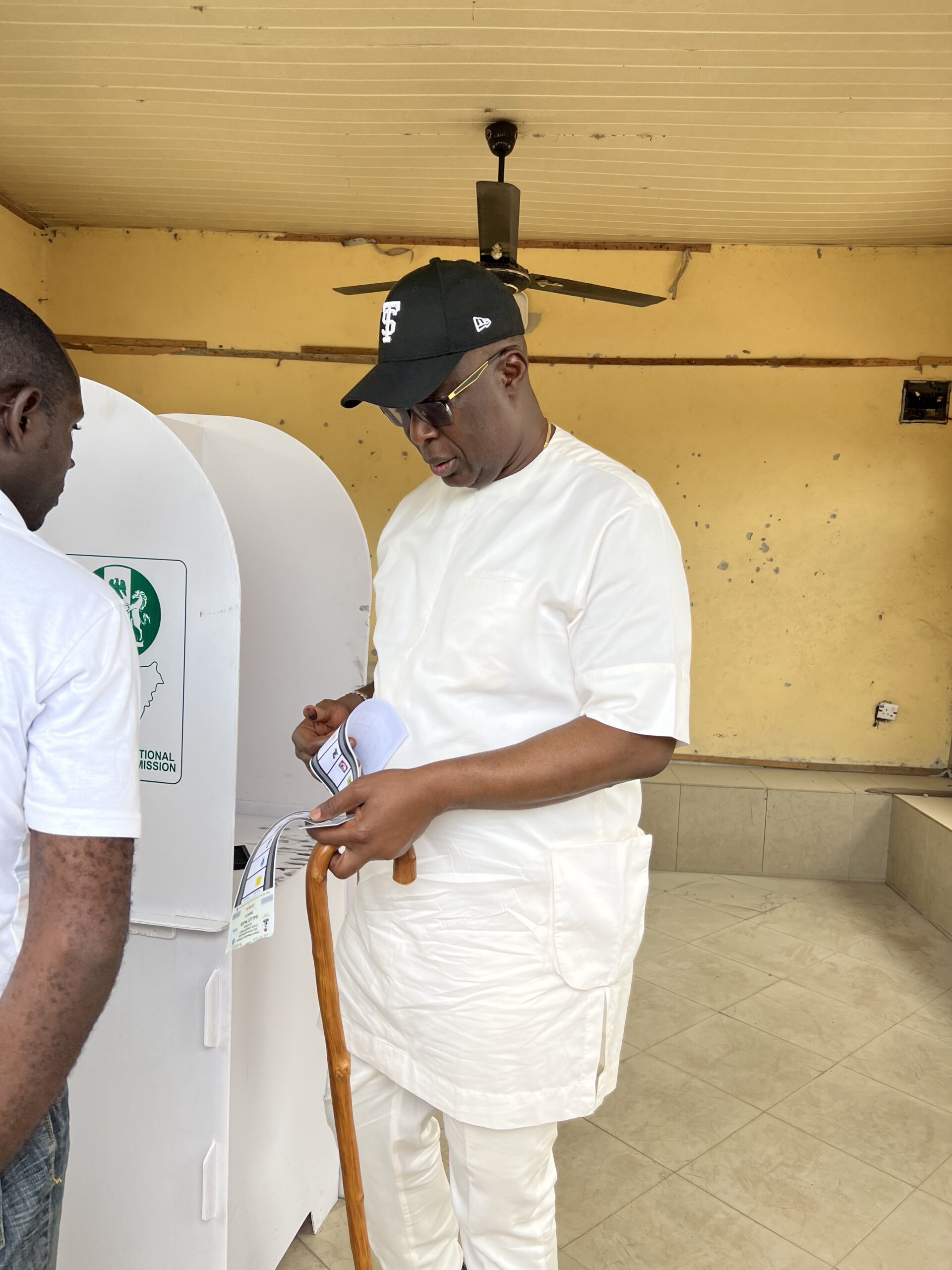 Minister of State for Petroleum Resources, Chief Timipre Sylva (CON), at Polling Unit 4, Dukuraku Central Open Space, Okpoama, Ward 4 , Brass Constituency II, for the Bayelsa State House of Assembly Election on Saturday, 18 March 2023