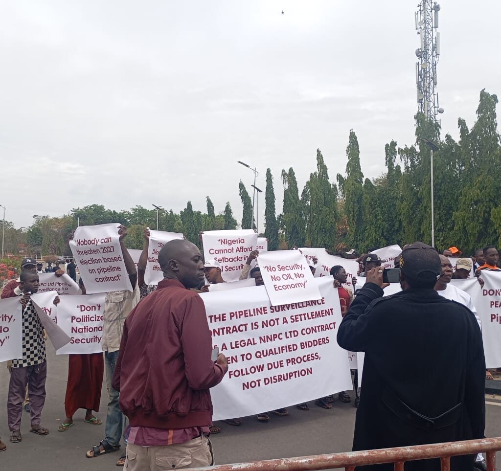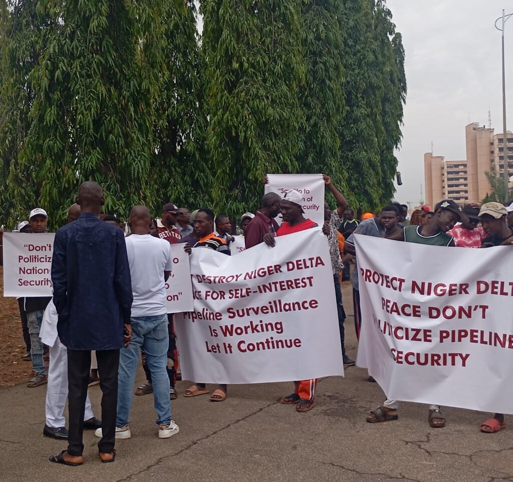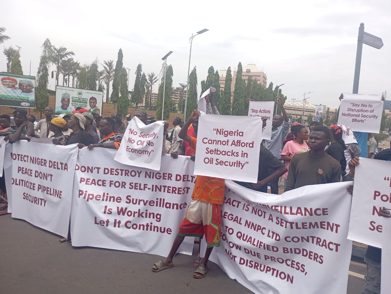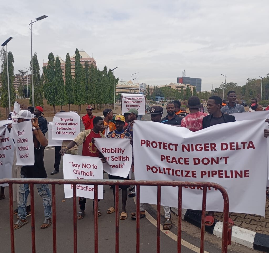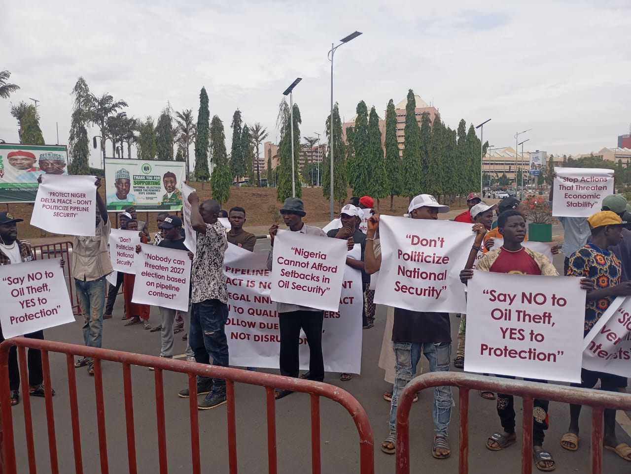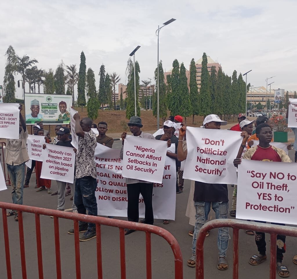 The demonstrators displayed placards during the protest carrying inscriptions such as “Nigeria cannot afford setbacks in oil security,” “Don’t destroy Niger Delta peace for self-interest,” “Nobody can threaten 2027 election based on pipeline contract”, “say no to disruption of national security efforts”, among others.