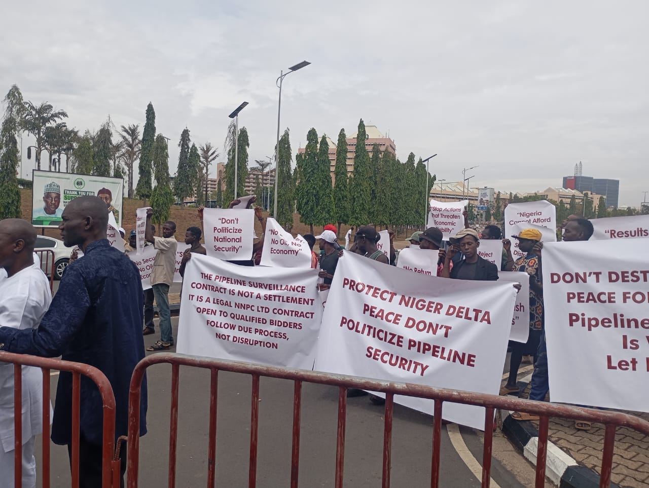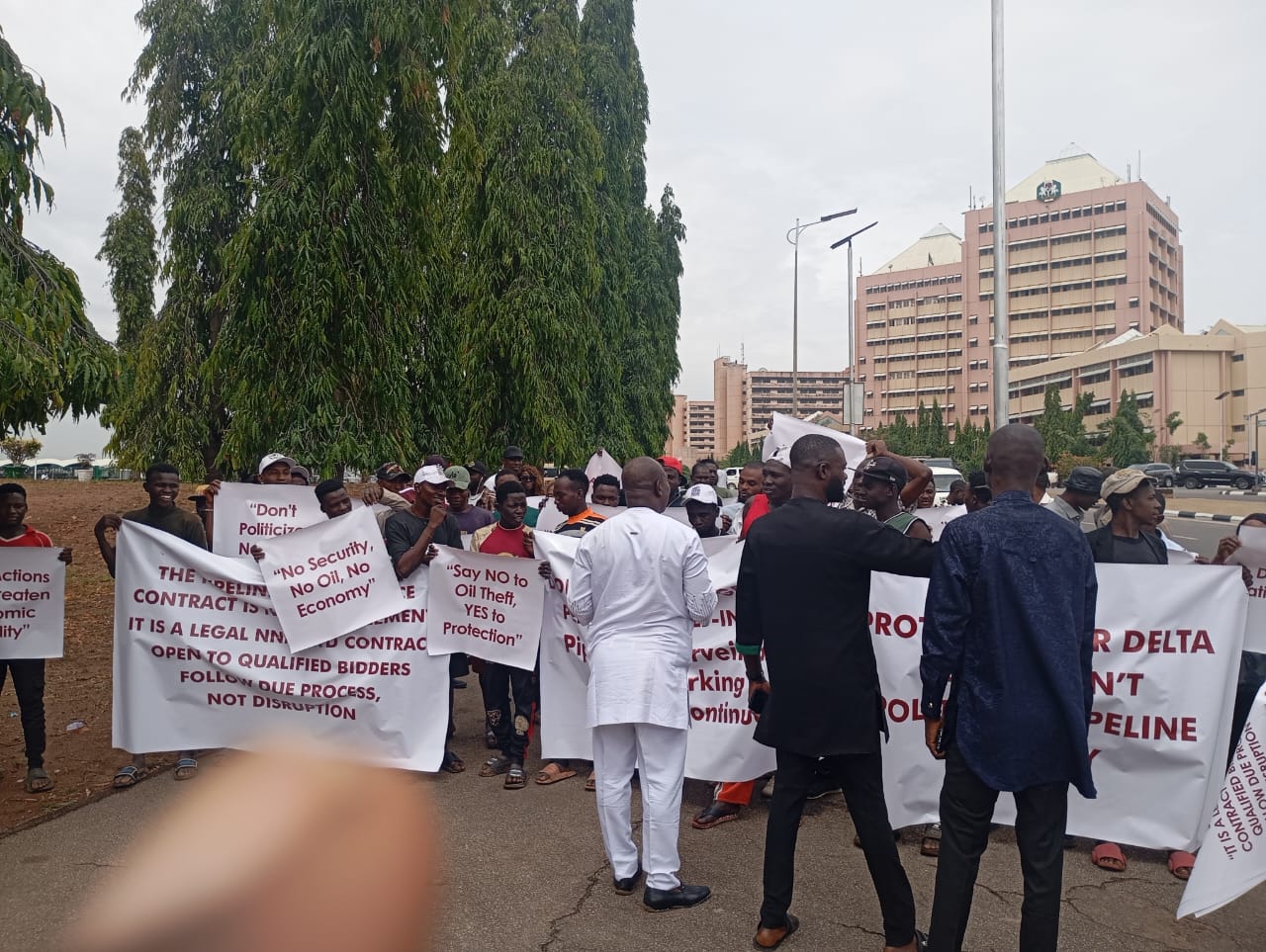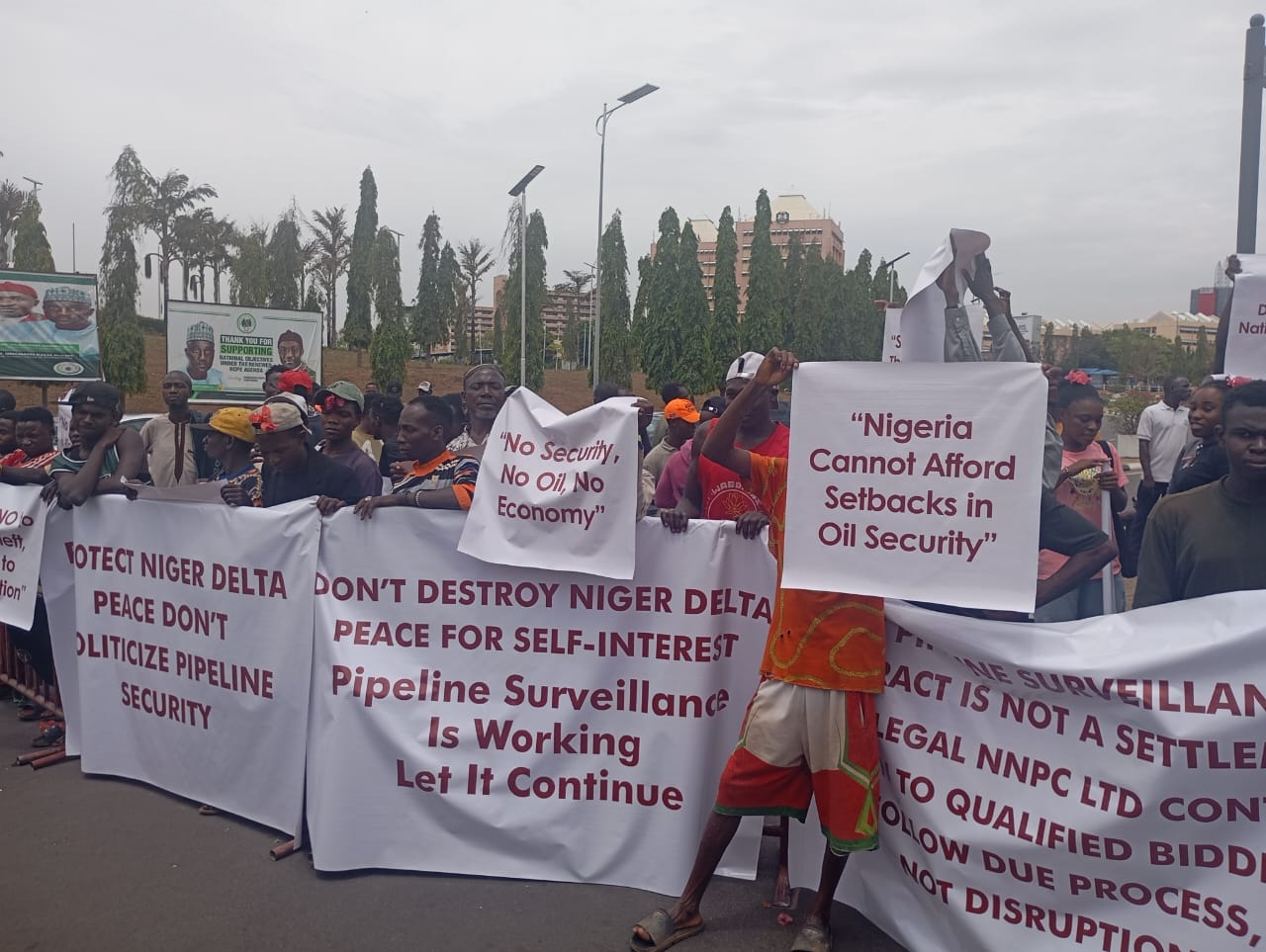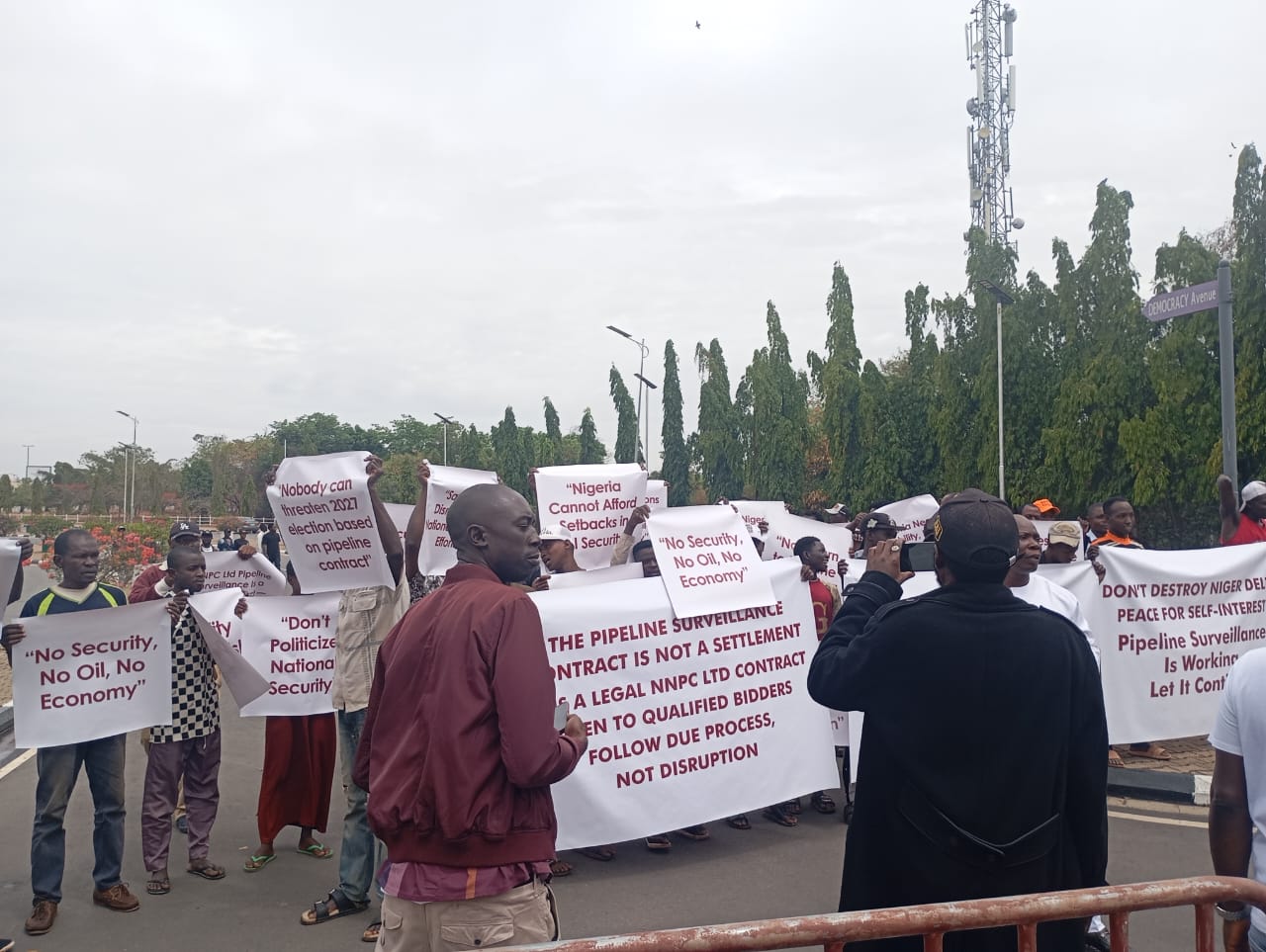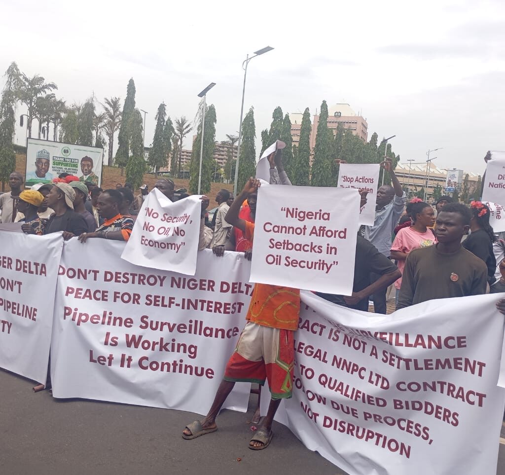 The demonstrators displayed placards during the protest carrying inscriptions such as “Nigeria cannot afford setbacks in oil security,” “Don’t destroy Niger Delta peace for self-interest,” “Nobody can threaten 2027 election based on pipeline contract”, “say no to disruption of national security efforts”, among others.