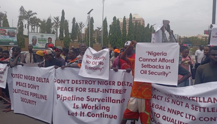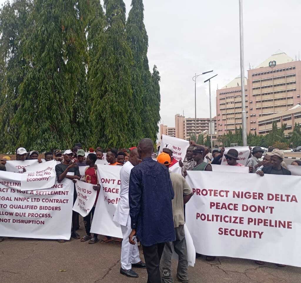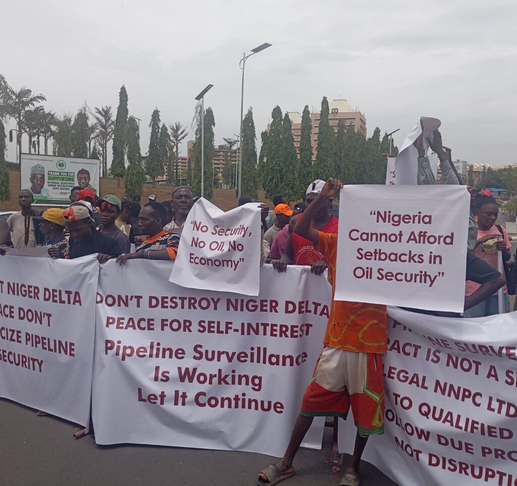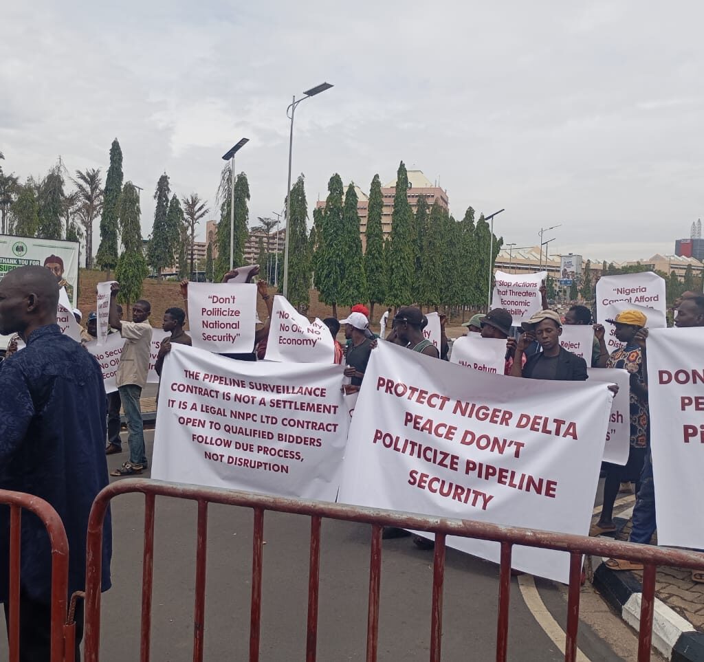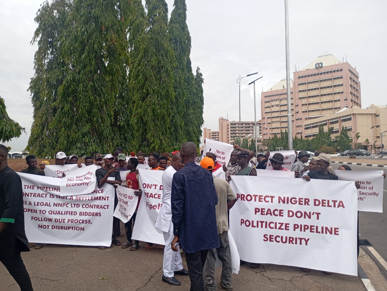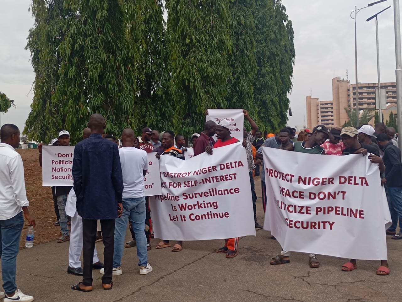 The demonstrators displayed placards during the protest carrying inscriptions such as “Nigeria cannot afford setbacks in oil security,” “Don’t destroy Niger Delta peace for self-interest,” “Nobody can threaten 2027 election based on pipeline contract”, “say no to disruption of national security efforts”, among others.