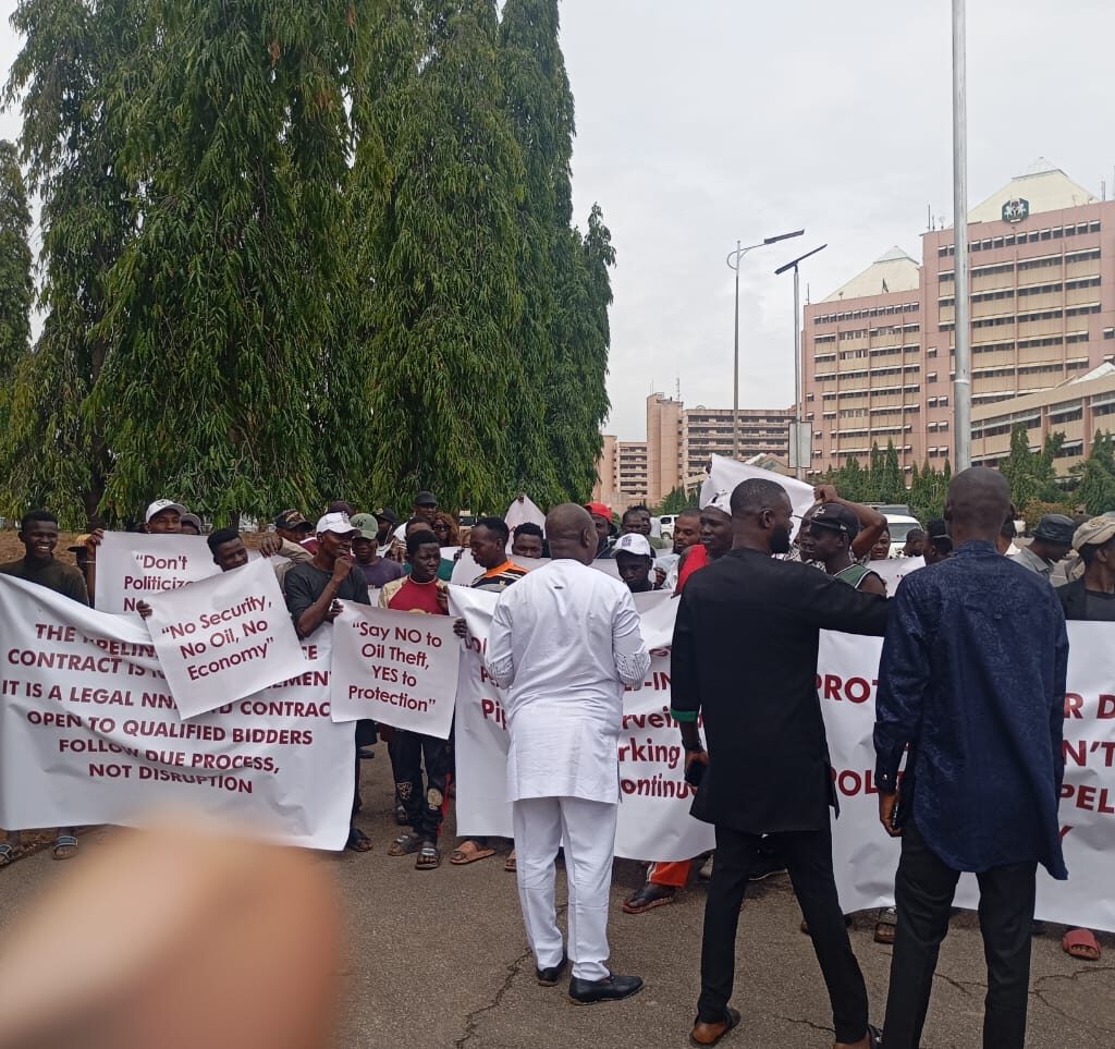Protesters under the aegis of Concerned Niger Delta Stakeholders on Tuesday stormed the National Assembly, opposing calls to decentralise the pipeline surveillance contract currently handled by Tantita Security Services Nigeria Limited.