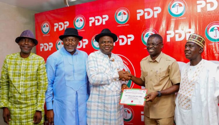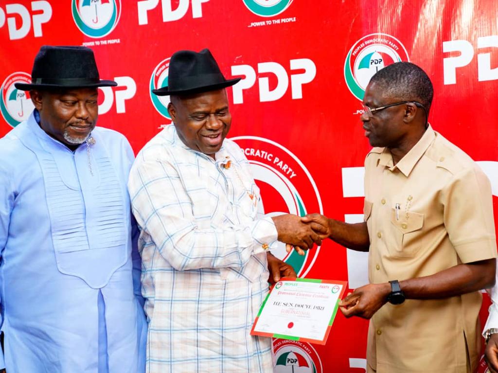 Chairman of the Guber Screening Committee for Bayelsa State and Deputy Governor of Edo State, Comrade Philip Shaibu, presented Diri with his clearance certificate while party officials looked on.